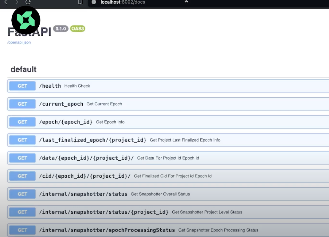 As the node continues snapshotting data, the quickest way to check the snapshotted data is to check against epoch_id and project_id returned in the logs. Copy these values and paste them in the endpoint to retrieve project data in the SwaggerUI exposed against the core API.
