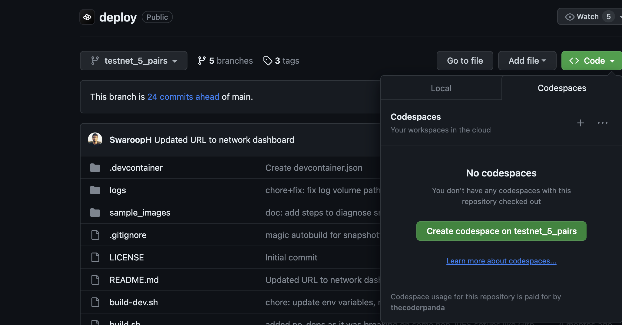 Finally, you'll see a large button that says, "Create codespace on testnet_5_pairs.” Click on that button to create your codespace on the testnet_5_pairs branch.
