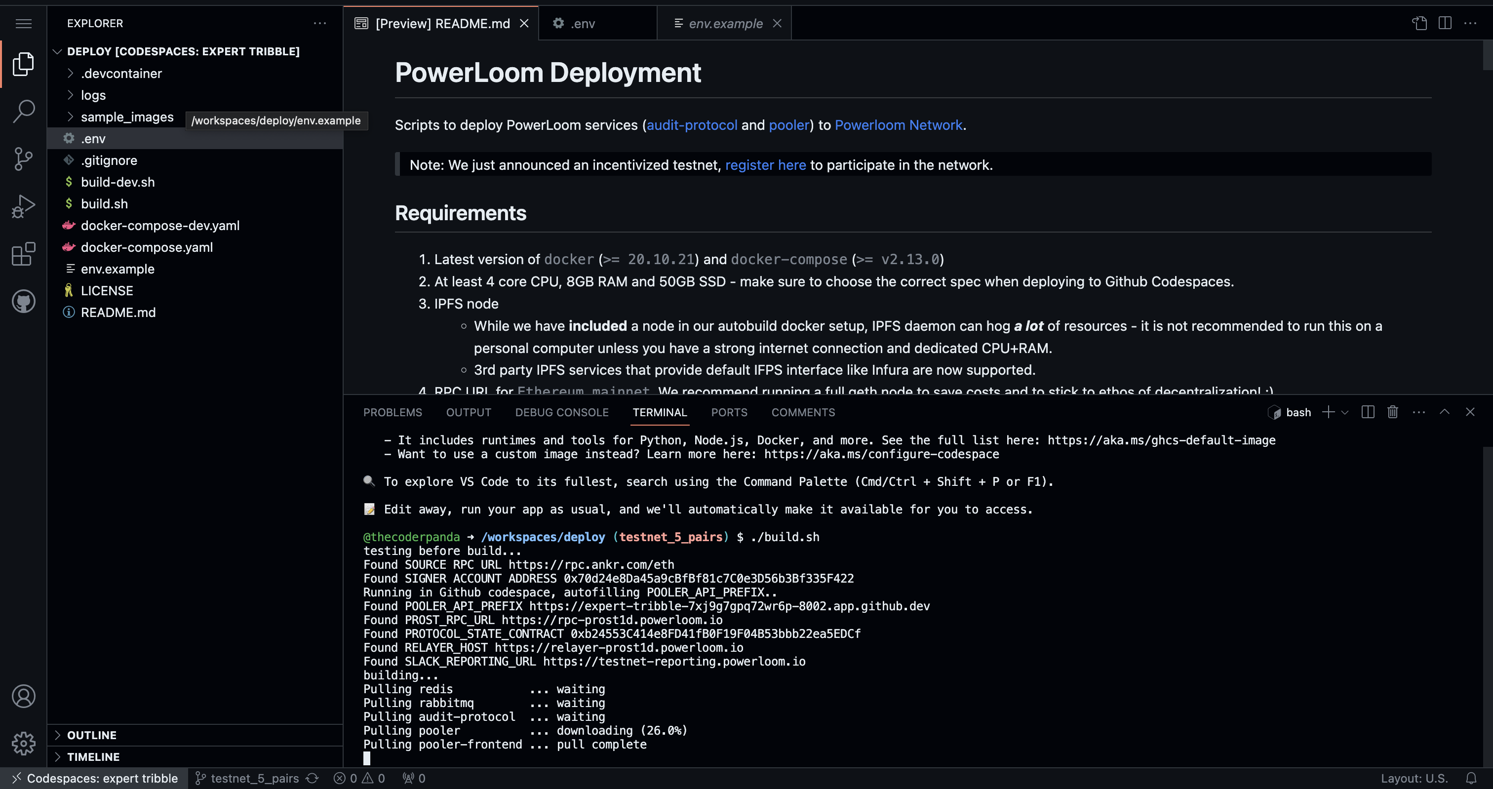 Running the script will take some time as it retrieves all the necessary Docker images from the registry and runs them locally on the virtual machine (Codespaces).