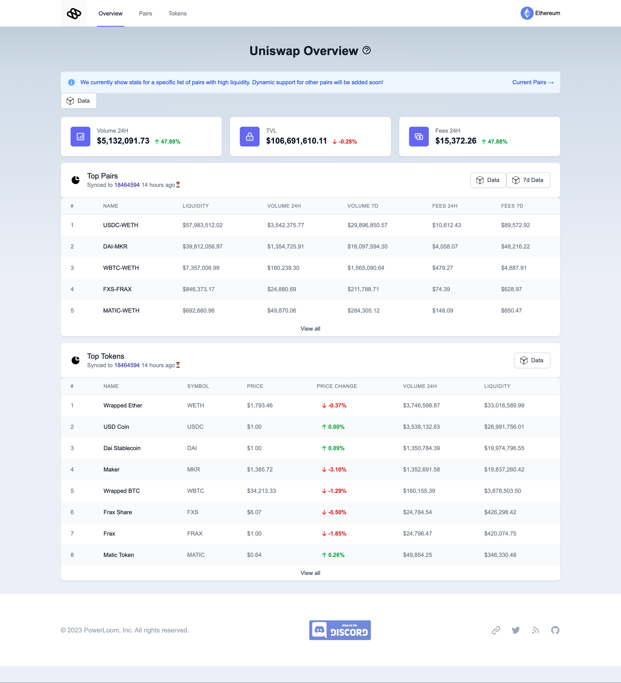 - Once all the services are active, you can access the front end via Pooler Frontend. The dashboard will display a summary of data for UNISWAPV2, similar to PowerLoom UNISWAPV2 Prod.