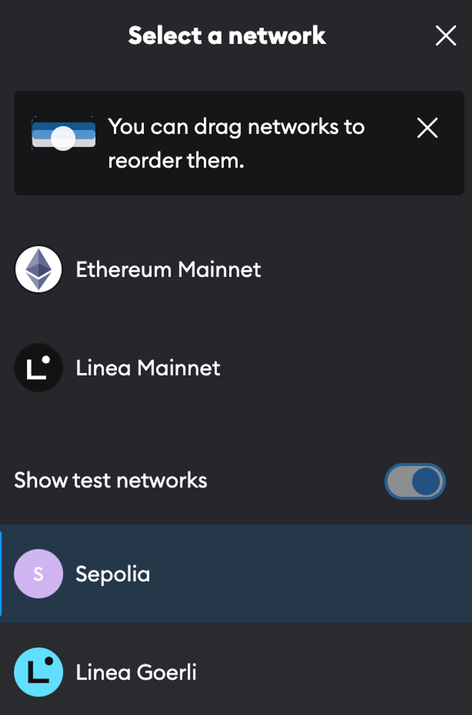 - Click on the toggle “Show test networks” and select Sepolia