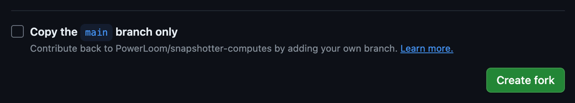 - Make sure to uncheck “copy the main branch only” and then click “Create fork”