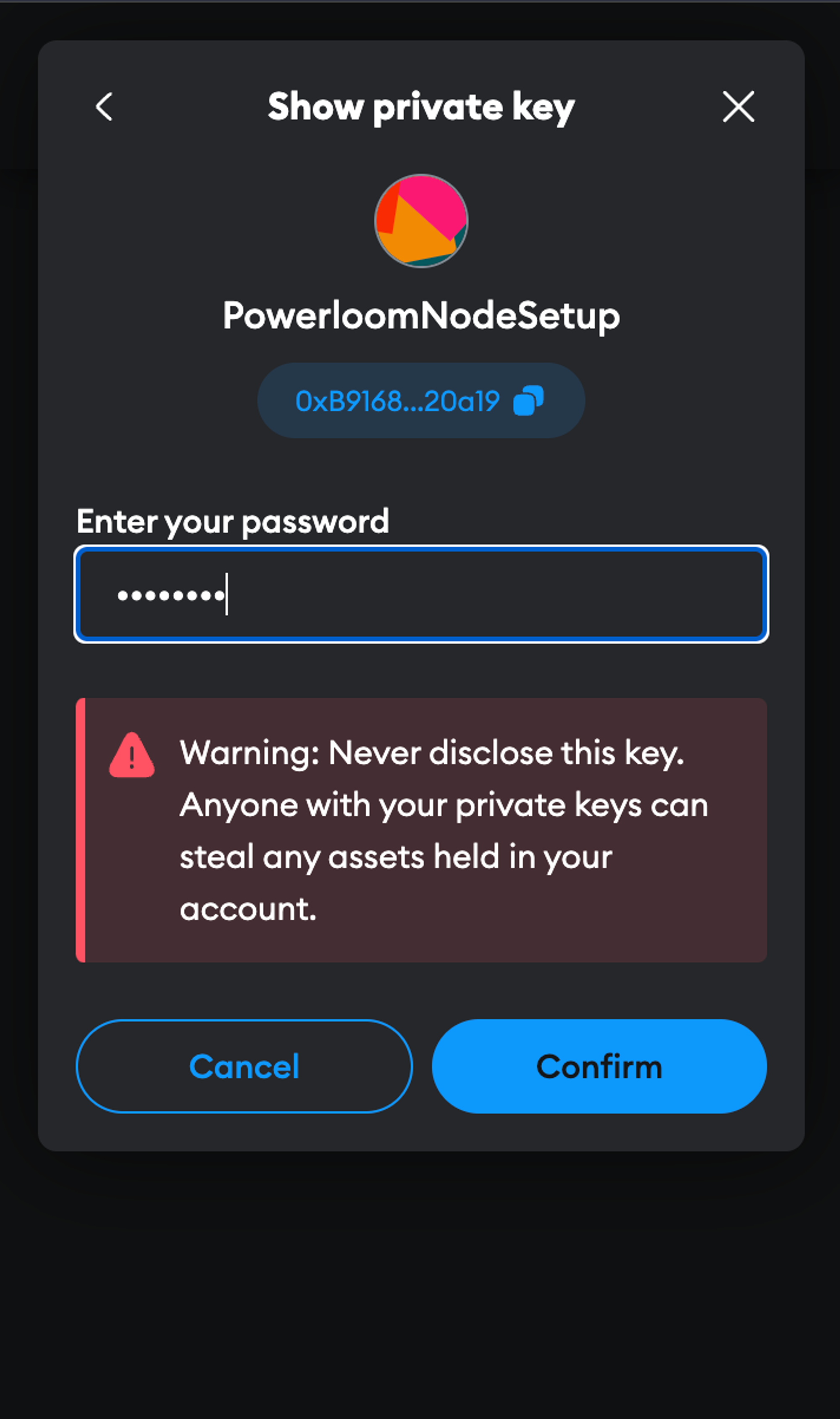 Enter the password, and as you can see, it is telling us to never share private keys with anyone. We have set up a burner wallet so no worries. Now click and hold on “Hold to reveal your Private Key.” Copy it and paste in .env for SIGNER_ACCOUNT_PRIVATE_KEY