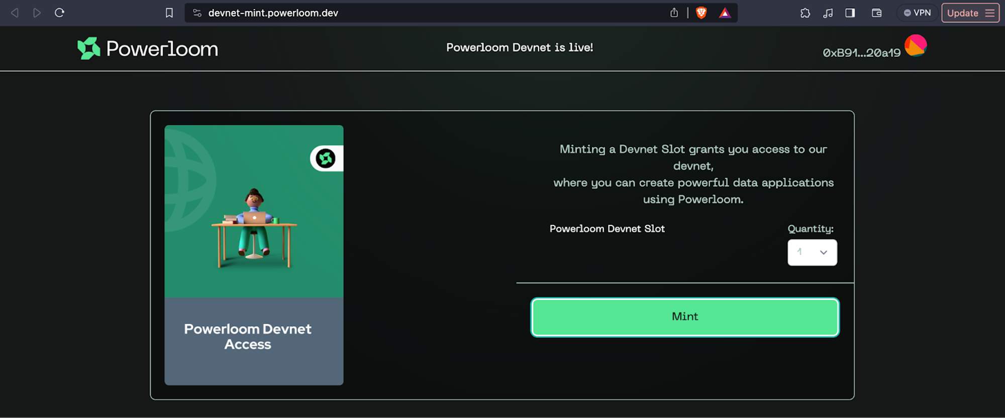 - Visit https://devnet-mint.powerloom.dev and connect your wallet. You can select the “quantity” of slots you want to mint. Let’s start with 1. You can mint more as well depending on your requirements. Then, click “Mint”: