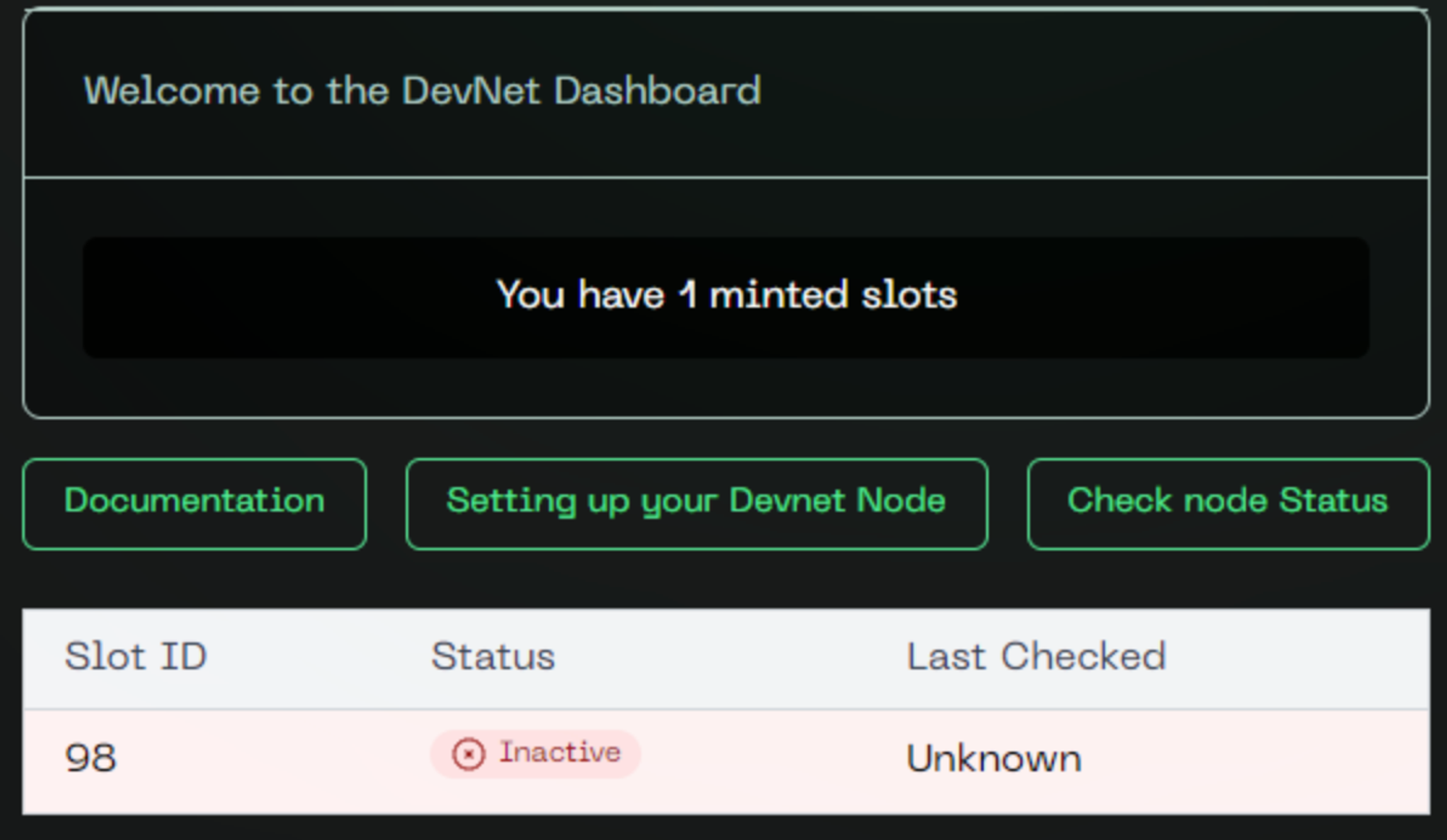 - Go back to your Devnet dashboard and click “Check node status” and the Status of your respective SLOT_ID is now Active