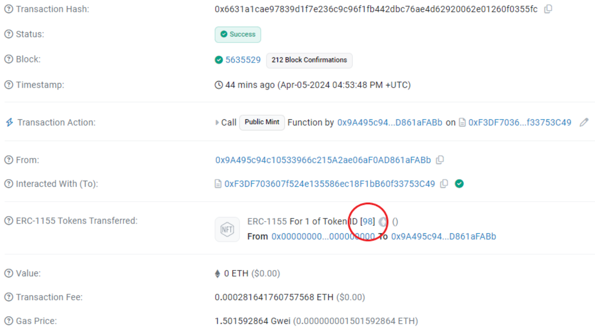 - Locate the minted Token ID under the ERC-1155 Tokens Transferred section.